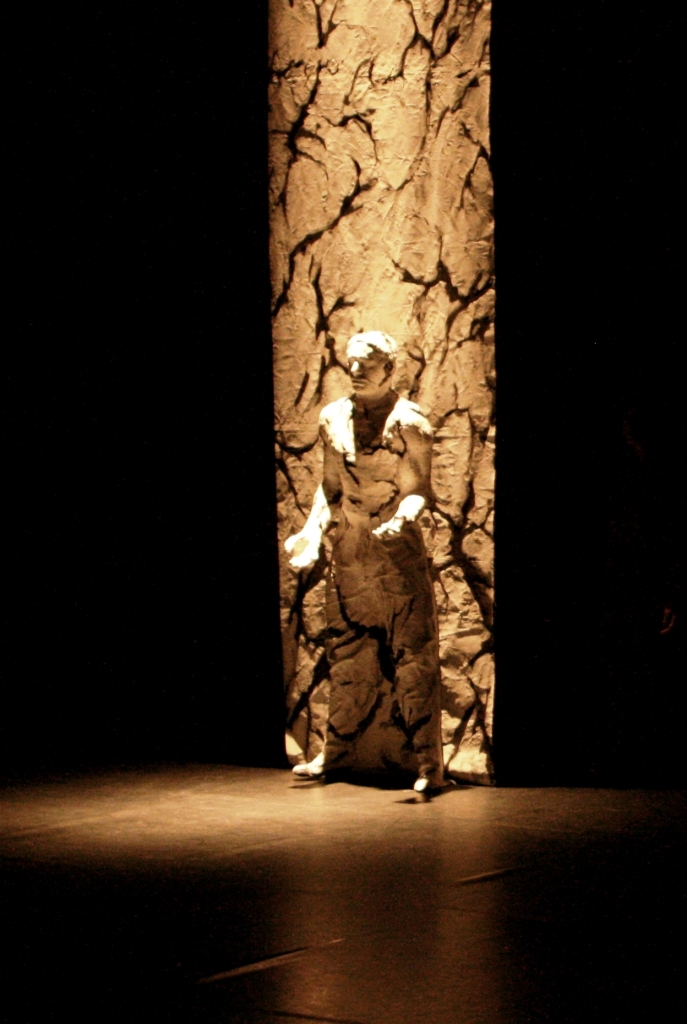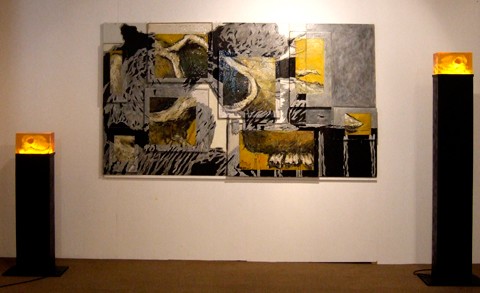 Colonnes lumineuses : terre, résine, bois, lumière artificiel